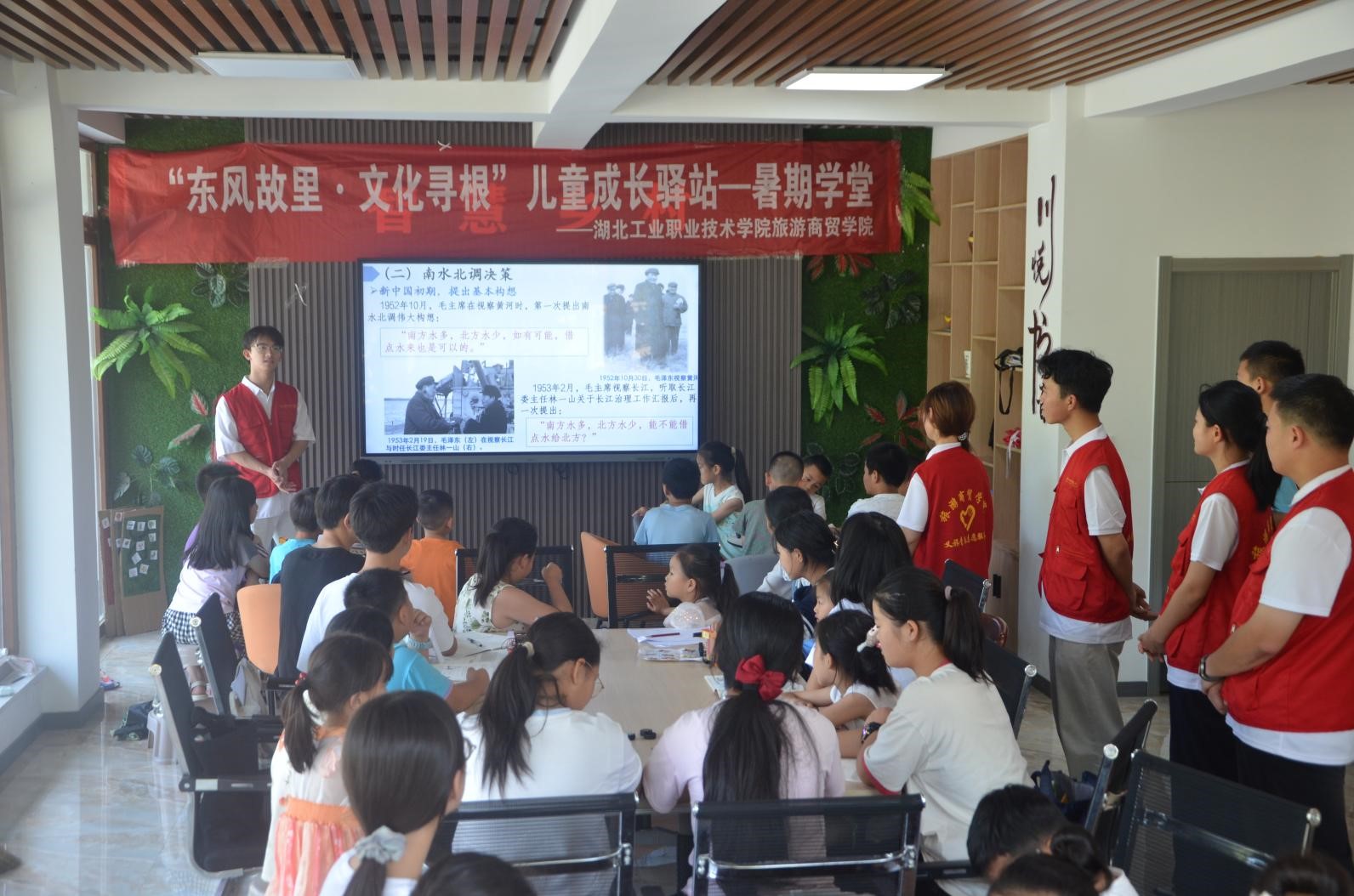 在《南水北调的伟大实践与感人移民故事》主题课堂上,志愿者们借助科普视频与图文并茂的PPT,为孩子们全景式展现了这项“功在当代、利在千秋”工程的建设历程。从丹江口水库大坝加高扩容的攻坚时刻,到数万移民“舍小家为大家”的迁徙史诗,一个个鲜活故事让孩子们读懂“每一滴北送的清水都承载着责任与奉献”。当讲到“丹江口水库的水一路北上,滋养着北京、天津等数十座城市”时,现场惊叹声此起彼伏,孩子们纷纷表示“要像保护眼睛一样保护家乡的水”。